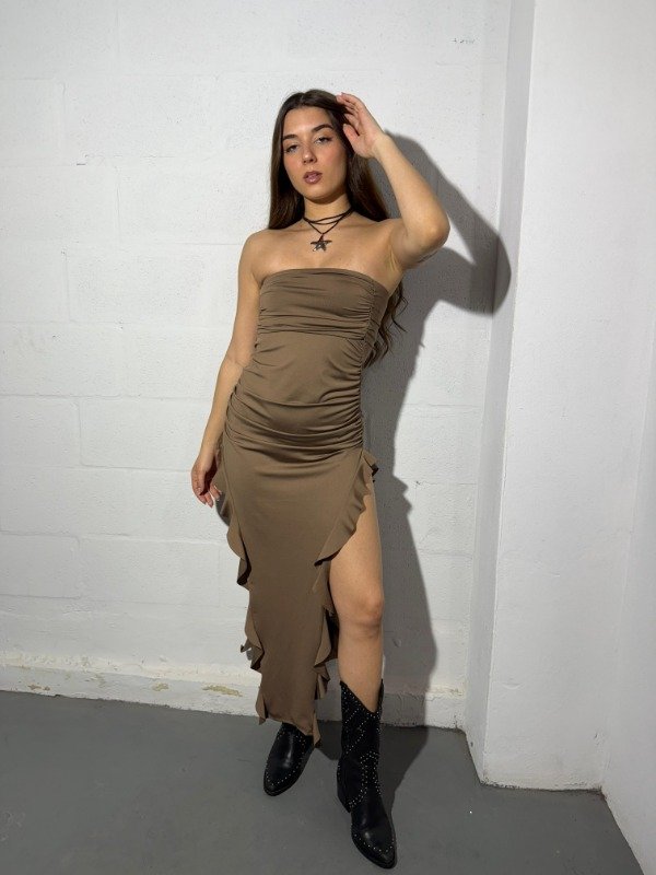 Vestido straples voladitos largo microfibra